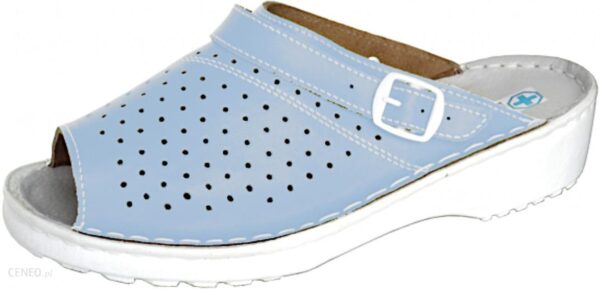 Klapki medyczne perforacja z paskiem niebieskieWysokiej jakości komfortowe obuwie wykonane ze skóry naturalnej z profilowanymi podeszwami oraz powłokami zabezpieczającymi powierzchnię przeznaczone dla Pań pracujących w szpitalach, klinikach domach opieki.Opis techniczny:wierzch – skóra bydleca naturalna pokryta specjalna membrana ulatwiajaca czyszczenie i dezynfekcje. Cholewka zamknięta z perforacją pasek dwufunkcyjny przekładany na piętę.wyściółka – skóra naturalnaspód – o urzeżbieniu przeciwpoślizgowym z poliuretanu (PU), obcas 3,5cm, wewnętrzny profil ortopedyczny.Sposób montażu – wierzch łączony ze spodem szyciem ręcznymObuwie atestowane: PN-EN ISO 20 347 : 2012Dostępne rozmiary od 36 do 42