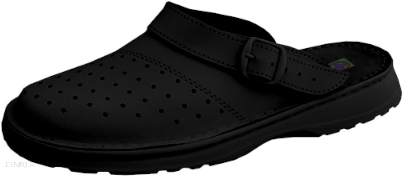 Klapki medyczne męskie czarneWysokiej jakości komfortowe obuwie wykonane ze skóry naturalnej pokrytej membraną. Profilowane ortopedycznie z antypoślizgowymi podeszwami dedykowane Panom pracującym na oddziałach szpitalnych w przychodniach domach opieki i innych placówkach medycznych.Opis techniczny:wierzch – cholewka skórzana wykonana ze skór naturalnych wykończona powłokami odpornymi na zmywanie ,cholewka zamknięta z otworami wentylacyjnymi, pasek dwufunkcyjny z możliwością założenia na piętę lub ułożenia na cholewce wyściółka – skóra naturalna w kolorze brązowym spód – o urzeźbieniu przeciwpoślizgowym z poliuretanu (PU) wewnętrzny profil ortopedyczny , sposób montażu – wierzch łączony ze spodem szyciem ręcznymObuwie atestowane: PN-EN ISO 20 347 : 2012Dostępne rozmiary od 39 do 47