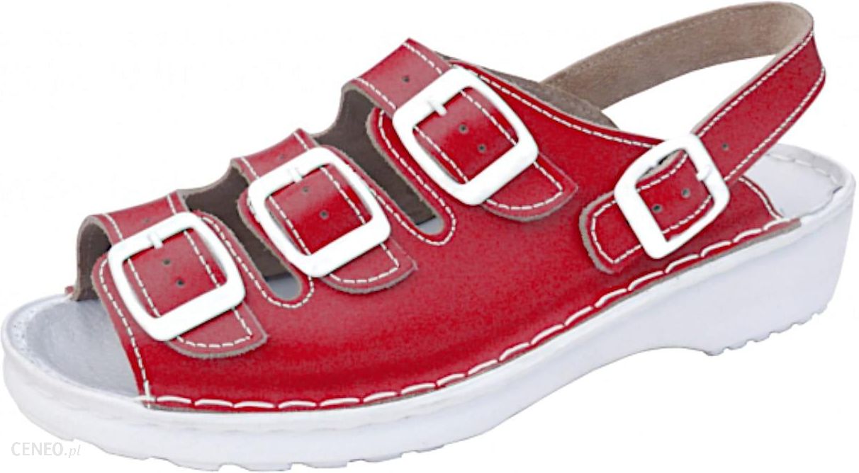 Klapki medyczne czerwone OLA z paskiemWysokiej jakości komfortowe obuwie wykonane ze skóry naturalnej z profilowanymi podeszwami oraz powłokami zabezpieczającymi powierzchnię przeznaczone dla Pań pracujących w szpitalach, klinikach domach opieki.Opis techniczny:wierzch – skóra bydlęca licowa pokryta specjalną membraną ułatwiającą czyszczenie i dezynfekcją , regulacja tęgości 3 paski + pasek za piętęwyściółka – skóra naturalnaspód – o urzeźbieniu przeciwpoślizgowym z poliuretanu (PU), obcas 3,5cm, wewnętrzny profil ortopedyczny.Sposób montażu – wierzch łączony ze spodem szyciem ręcznymObuwie atestowane: PN-EN ISO 20 347 : 2012Dostępne rozmiary od 36 do 42