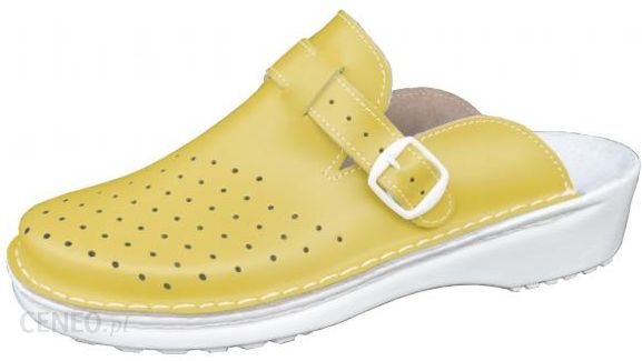 Klapki medyczne żółte AGAWysokiej jakości komfortowe obuwie dla personelu medycznego, skórzane.Opis techniczny:wierzch – skóra bydlęca naturalna pokryta specjalną membraną ułatwiającą czyszczenie i dezynfekcje.Cholewka zamknięta z perforacją pasek z regulacja tęgości.wyściółka – skóra naturalnaspód – o urzeźbieniu przeciwpoślizgowym z poliuretanu (PU), obcas 3,5cm, wewnętrzny profil ortopedyczny.Sposób montażu – wierzch łączony ze spodem szyciem ręcznymObuwie atestowane: PN-EN ISO 20 347 : 2012Dostępne rozmiary od 36 do 42