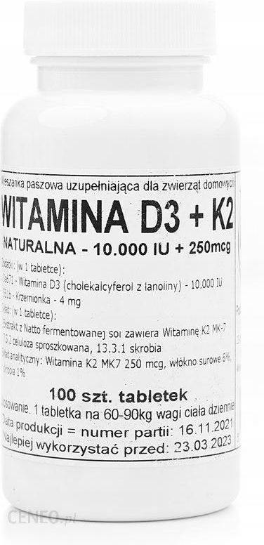 Witaminy D3 + K2 10000IU + 250mcg – 100 tab. PodkowaDodatki: (w 1 tabletce):3a671 – Witamina D3 (cholekalcyferol z lanoliny) – 10.000 IU551b – Krzemionka – 4 mgSkład: (w 1 tabletce):Ekstrakt z Natto fermentowanej soi7.8.2 celuloza sproszkowana13.3.1 skrobiaSkład analityczny: Witamina K2 MK7 250 mcg, włókno surowe 6%, skrobia 1%Stosowanie: 1 tabletka na 60-90 kg wagi ciała dziennieTabletki można dzielićMieszanka paszowa uzupełniająca dla zwierząt domowychProdukt wolny od: stearynianu magnezu, dwutlenku tytanu, laktozy, glutenu, konserwantów, antyzbrylaczy, soli, cukru, syntetycznych słodzików, aromatów i barwników