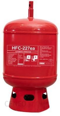 Samoczynne urządzenie o pojemności 4KG na gaz HFC-227ea • 68ºC temperatura uruchomienia• Wysokość 40,5 cm.• Średnica 21,3 cm.Urządzenie certyfikowane CE Heptafluoropropan, apafluran – organiczny związek chemiczny, fluoropochodna propanu, stosowany środek gaśniczy używany w systemach elektromagnetycznych (np. w stałych urządzeniach gaśniczych), oznaczany kodem HFC-227ea. Magazynowany w postaci skroplonej, uwalniany jako bezbarwny, nieprzewodzący prądu elektrycznego gaz o lekkim eterycznym zapachu. Mechanizm gaśniczy HFC-227ea jest aktywny. Jego głównym działaniem jest fizyczne chłodzenie ognia w takim stopniu, że proces spalania nie może się sam podtrzymywać. HFC-227ea jest wydajnym przewodnikiem ciepła i należy do tej samej klasy środków, co substancje używane w przemyśle chłodniczym. Zalety „czystego” środka gaśniczego HFC-227ea: zajmuje niewielką powierzchnię składowania, do 7 razy mniej niż gazy obojętne szybkość działania: 10 sekund do uzyskania stężenia wystarczającego do ugaszenia ognia bezpieczny dla środowiska: tzw. zerowy potencjał niszczenia warstwy ozonowej może być stosowany do gaszenia pożarów sprzętu elektrycznego pod napięciem nie powoduje powstawania osadów i zabrudzeń po zastosowaniu niska toksyczność nie powoduje powstawania tzw. szoku termicznego dla elektroniki HFC-227ea należy do najpopularniejszych i najchętniej wybieranych gazowych środków gaśniczych w ochronie przeciwpożarowej. Środek ten jest, nieszkodliwy dla warstwy ozonowej i bezpieczny dla ludzi w określonych normatywnie stężeniach. Systemy gaśnicze HFC-227ea skutecznie gaszą pożary klas A, B i C, a gaz HFC-227ea jest całkowicie nieszkodliwy dla elektroniki i innego cennego sprzętu. Szybki rozwój technologii informatycznych i telekomunikacyjnych przyczynia się do ciągłego powstawania nowych obszarów zastosowań HFC-227ea. Gaz HFC-227ea charakteryzuje szybkość reakcji i wysoka efektywność – osiąga skuteczny poziom gaszenia w czasie do 10 sekund, tłumiąc wszystkie rodzaje ognia. To środek bezpieczny dla środowiska, czysty, bezwonny, bezbarwny i niepozostawiający śladów po wyzwoleniu. Jego unikalne działanie gaśnicze polega na obniżeniu temperatury, obniżeniu stężenia tlenu oraz absorpcji ciepła z płomienia. HFC 227ea jest akceptowany i uznawany na całym świecie przede wszystkich za sprawą bardzo szerokiego spectrum zastosowania. Pod względem chemicznym FE227TM oraz FM-200® są identyczne. Środek ten jest popularnym w świecie zamiennikiem halonu.
