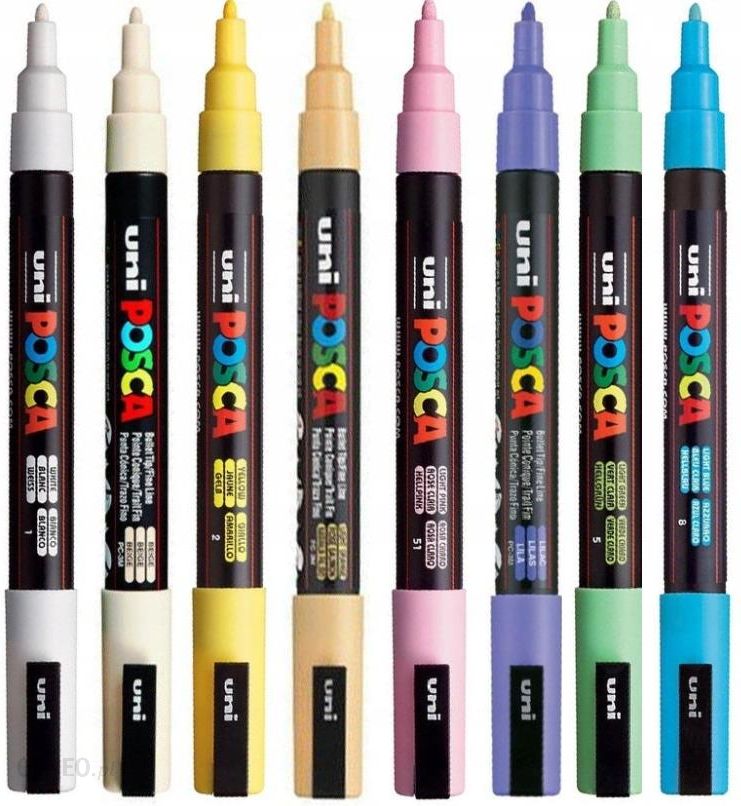 Uniwersalny marker UNI PC-3M z farbą plakatową do pisania i malowania po każdej powierzchni: papierze, tkaninie, plastiku, terakocie, szkle, porcelanie, metalu, drewnieodporny na działanie światła i warunków atmosferycznychtusz na bazie wody nie przesiąka przez papierróżne kolory tuszu po wyschnięciu nie łączą się ze sobącienka końcówka – grubość linii pisania: 0,9- 1,3 mm